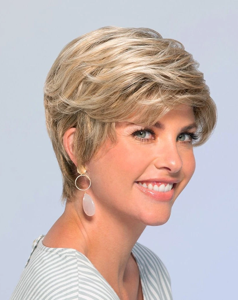 You can achieve several different looks with this short, layered wig. Use synthetic styling products, such as Piece Out Contour Creme by Jon Renau, to achieve different textures.