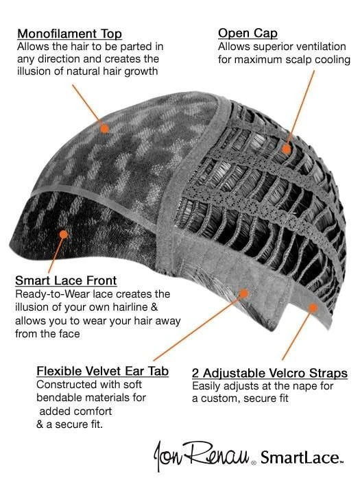 Annette by Jon Renau is a short synthetic hair wig. This chic style features a combination of the SmartLace™ technology, which offers the most natural hairline available, and a monofilament top for an ultra-natural look. Additional features include an open cap, velvet ear tabs, and adjustable tabs for optimum comfort and fit. The actress Annette Bening inspired this sophisticated and sexy wig style.