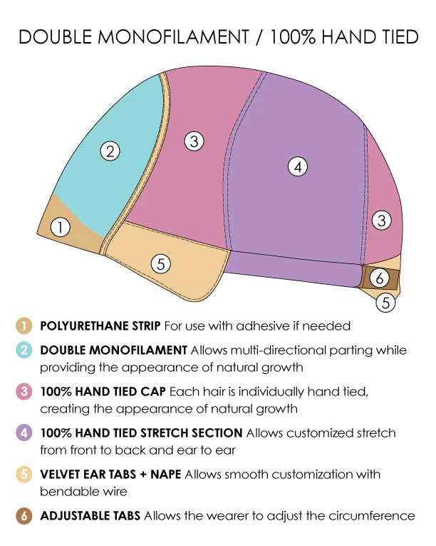 Elegant side-swept bangs and cascading long layers exude chic allure. The hand-tied mono top allows for versatile styling in any direction – let your imagination reign!