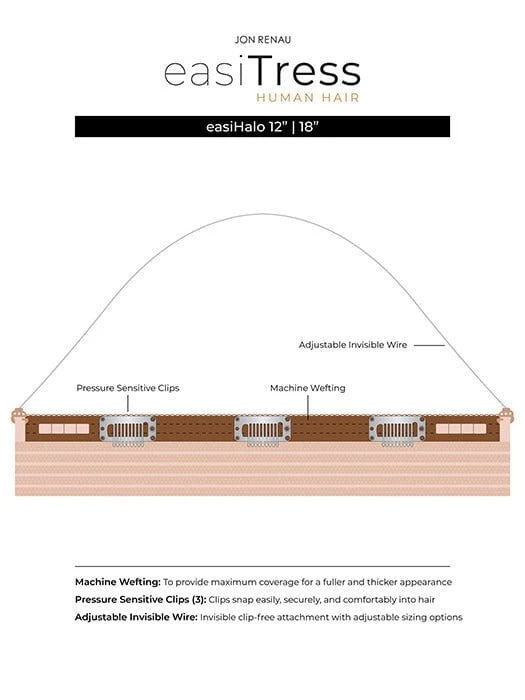 The easiHalo 18″ human hair extension by Jon Renau is easy to apply and remove for quick and easy wear. This handmade halo extension has an adjustable invisible wire that disappears into your hair for a discreet and secure fit. This style features gradual layers of high quality 100% Chinese Human Hair that blends into your biological hair for an instantaneous voluminous look. Also available in 12″ and 22″ lengths.