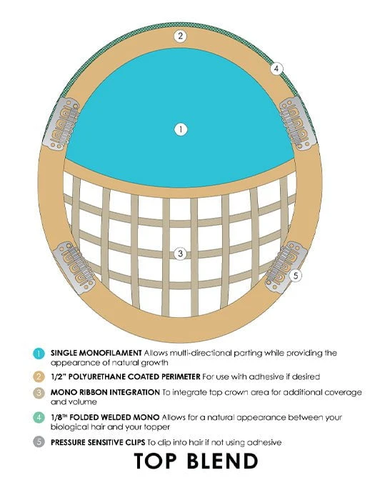 Top Blend by Jon Renau is built to increase fullness and add volume to the crown of the head by blending with your natural hair for an ultra-realistic effect. Top Blend is designed for early hair loss at the front. Because of its unique design to blend hair at the crown, Top blend is designed specifically for hair loss at the front and not suitable for hair loss at the crown. This hair topper has a single layer base, a strong ribbon at the back, and a border with a special coating. The four clips are placed just right for secure wear.